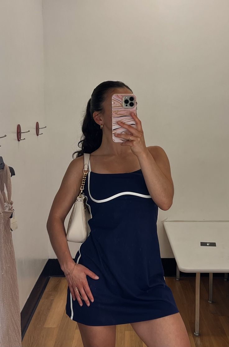 How cute is this dress? From the contrasting piping to the adorable A-line fit that swoops in at the waist and eases out through the hips, there’s nothing not to love. It's practical, too, with built-in shorts (plus pockets) and a shelf bra with removable cups. And the Airbrush fabric is smoothing but not overly compressive—prime for working out or wearing out.